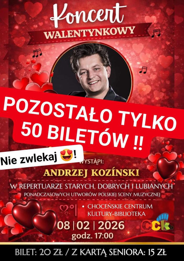 W Choceńskim Centrum Kultury – Bibliotece szykuje się wieczór, który może stać się jednym z najmocniejszych punktów lutowego kalendarza wydarzeń. W sobotę 8 lutego 2026 roku o godz. 17:00 odbędzie się koncert walentynkowy Andrzeja Kozińskiego. Organizatorzy informują, że w sprzedaży pozostało już tylko 50 biletów.