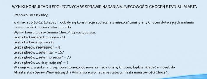 Od 6 do 12 października 2025 roku mieszkańcy gminy Choceń mogli wziąć udział w konsultacjach społecznych dotyczących nadania ich miejscowości statusu miasta. Głosowanie zostało zorganizowane przez Urząd Gminy, a jego celem było poznanie opinii lokalnej społeczności w sprawie, która od dłuższego czasu budziła zainteresowanie i emocje wśród mieszkańców.