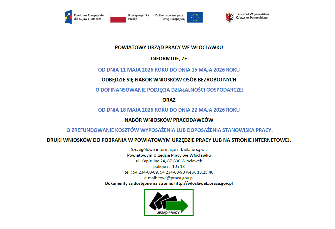 Powiatowy Urząd Pracy we Włocławku zapowiedział, że nabór wniosków o dofinansowanie rozpoczęcia działalności gospodarczej potrwa od 11 maja do 15 maja 2026 roku. Dokumenty mogą składać osoby bezrobotne zarejestrowane w urzędzie.
