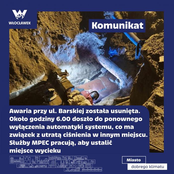 Zgodnie z wcześniejszymi zapowiedziami, w nocy system ciepłowniczy MPEC odzyskał pełną sprawność techniczną. Tym samym awaria przy ul. Barskiej została usunięta.
