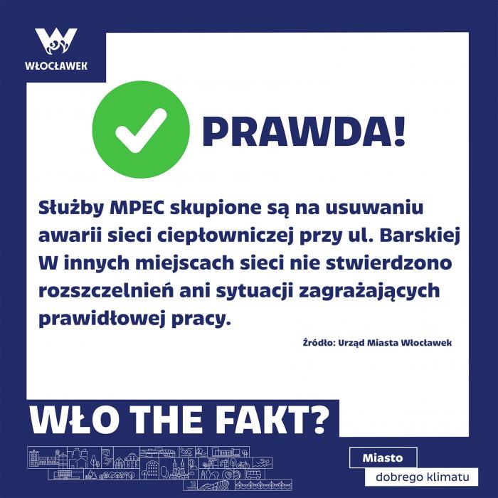 W oficjalnym komunikacie opublikowanym w ramach akcji „WŁO THE FAKT?” magistrat potwierdza, że służby MPEC skupione są wyłącznie na usuwaniu awarii przy ul. Barskiej. W innych miejscach sieci nie stwierdzono rozszczelnień ani zagrożeń dla prawidłowej pracy systemu.