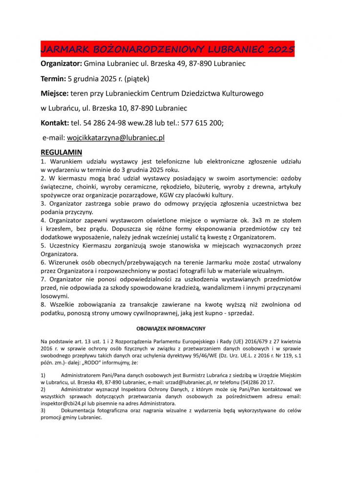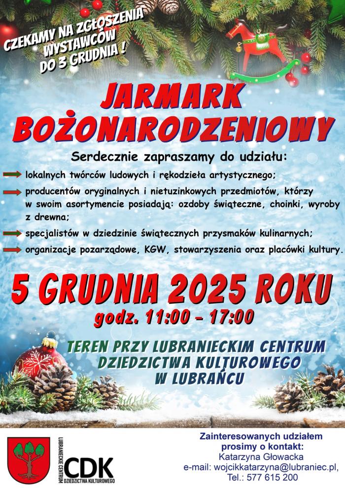 Zgłoszenia wystawców Zgłoszenia udziału w jarmarku przyjmowane są telefonicznie lub elektronicznie do 3 grudnia 2025 roku. Wystawcy mogą kontaktować się pod numerami telefonów oraz adresem e-mail podanym przez organizatora.