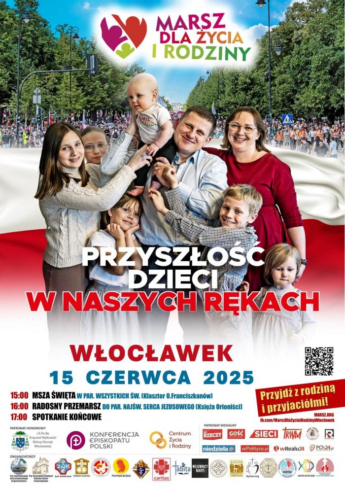 Marsz dla Życia i Rodziny 2025 we Włocławku odbędzie się już w niedzielę, 15 czerwca. To coroczne wydarzenie gromadzi mieszkańców miasta i okolic, którzy chcą zamanifestować poparcie dla wartości rodzinnych, szacunku dla życia oraz roli rodziny w społeczeństwie. W programie przewidziano mszę świętą, radosny przemarsz ulicami Włocławka oraz spotkanie końcowe. Hasło tegorocznej edycji brzmi: „Przyszłość dzieci w naszych rękach”. Sprawdź, kiedy i gdzie odbędzie się marsz.