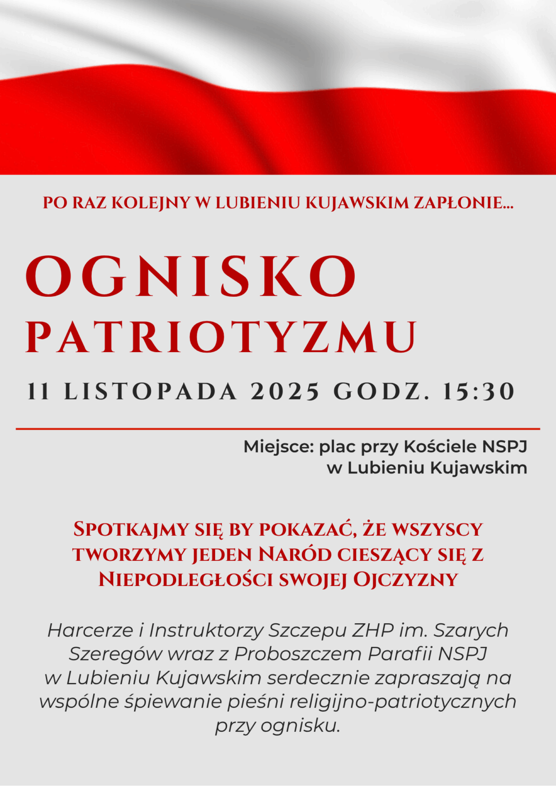 W blasku ognia i w atmosferze zadumy uczestnicy wydarzenia będą mogli wspólnie śpiewać pieśni religijne i patriotyczne, przypominając sobie, jak ważne są wiara, wolność i wspólnota. Ognisko stanie się miejscem spotkania pokoleń – dzieci, młodzieży, dorosłych i seniorów – których łączy wdzięczność za niepodległość i troska o przyszłość kraju.