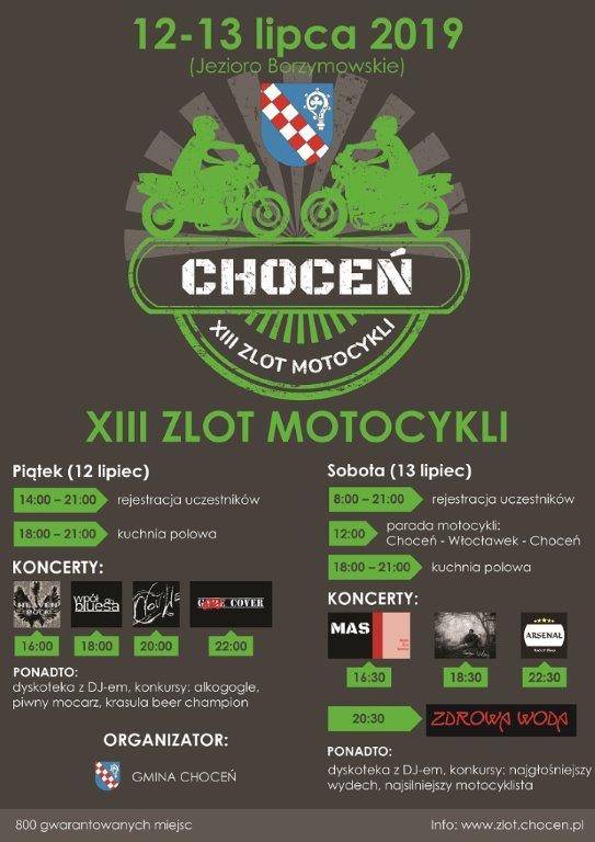 12-13 lipca 2019 roku odbyła się ogólnopolska impreza w Choceniu. To już XIII Zlot Motocykli. Na miłośników motocykli czekało w Choceniu dwa dni imprez integracyjnych. Będą też koncerty, dyskoteka na plaży, ognisko i palenie gumy.