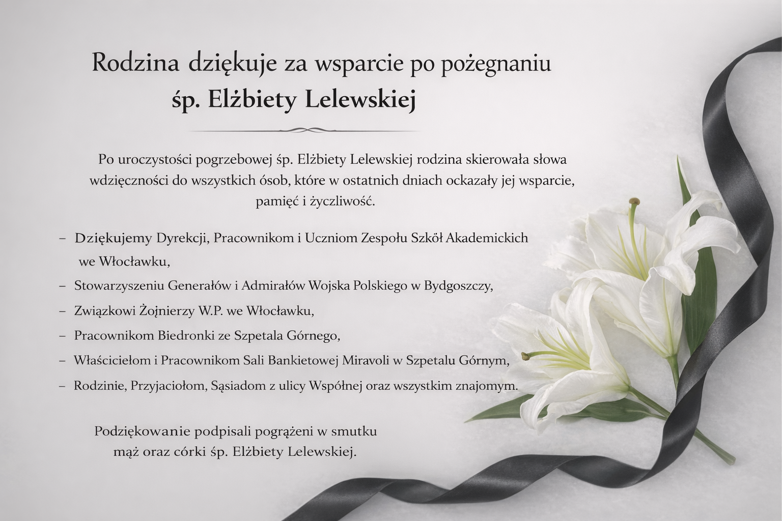 Podziękowanie podpisali pogrążeni w smutku mąż oraz córki śp. Elżbiety Lelewskiej.