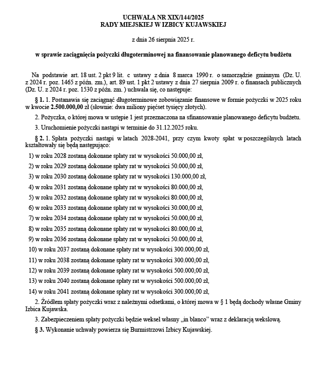 26 sierpnia 2025 r. radni przyjęli uchwałę XIX/144/2025, na mocy której gmina zaciąga pożyczkę długoterminową w wysokości 2,5 mln zł. Środki mają pokryć planowany deficyt, a spłata została rozłożona na lata 2028–2041. Zabezpieczeniem jest weksel własny „in blanco”, co w praktyce oznacza zobowiązanie rozłożone na pokolenia.