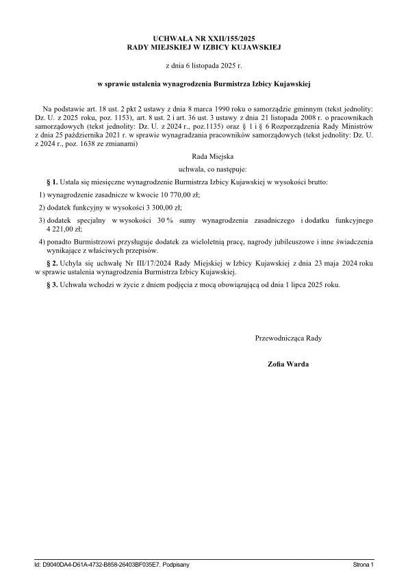 6 listopada 2025 r., podczas XXII sesji, przyjęto uchwałę XXII/155/2025 podwyższającą wynagrodzenie burmistrza do 18 291 zł brutto. Wzrost o 871 zł względem dotychczasowej kwoty 17 420 zł brutto obowiązuje z wyrównaniem od 1 lipca 2025 r.