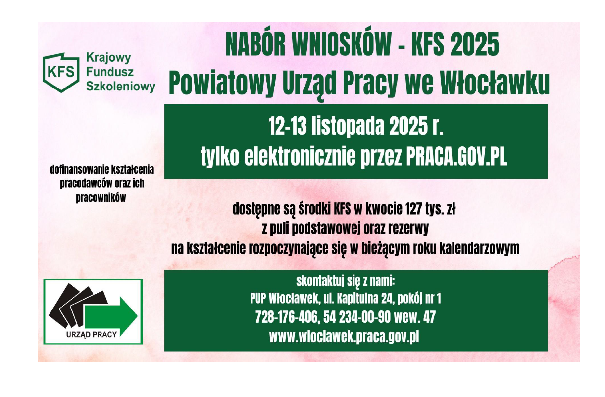 Powiatowy Urząd Pracy we Włocławku ogłasza nabór wniosków w ramach Krajowego Funduszu Szkoleniowego 2025. Wnioski można składać w dniach 12–13 listopada 2025 roku wyłącznie w formie elektronicznej, za pośrednictwem strony PRACA.GOV.PL.