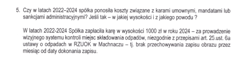 Saniko przyznało, że w latach 2022–2024 spółka zapłaciła karę w wysokości 1000 zł. Sankcja została nałożona w 2024 roku za prowadzenie wizyjnego systemu kontroli miejsc składowania odpadów niezgodnie z przepisami – konkretnie za brak przechowywania zapisu obrazu przez miesiąc od daty dokonania nagrania. Choć kwota jest symboliczna, sprawa pokazuje, że nawet w stabilnej finansowo spółce pojawiają się drobne uchybienia w zakresie zgodności z przepisami.