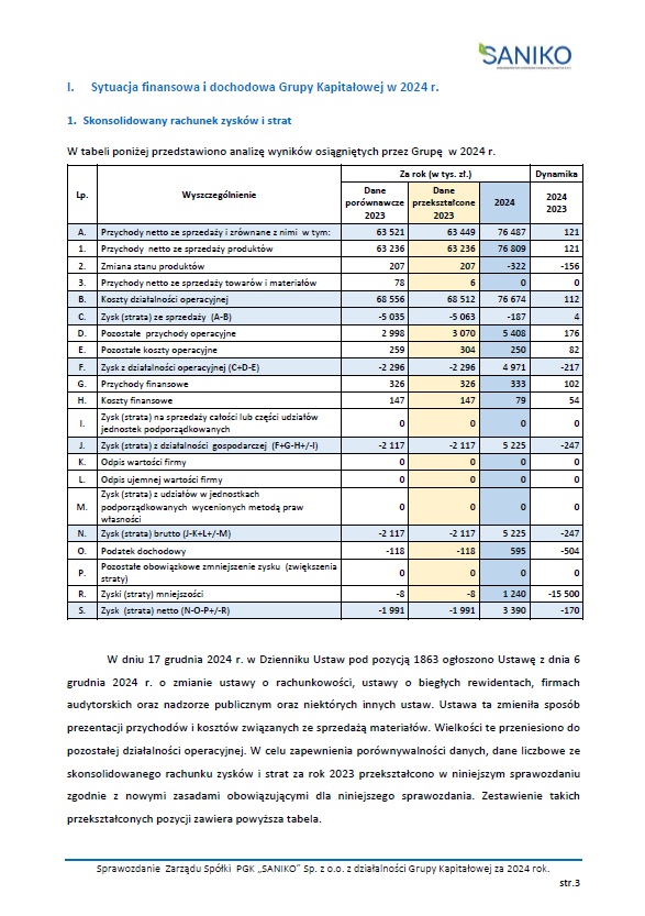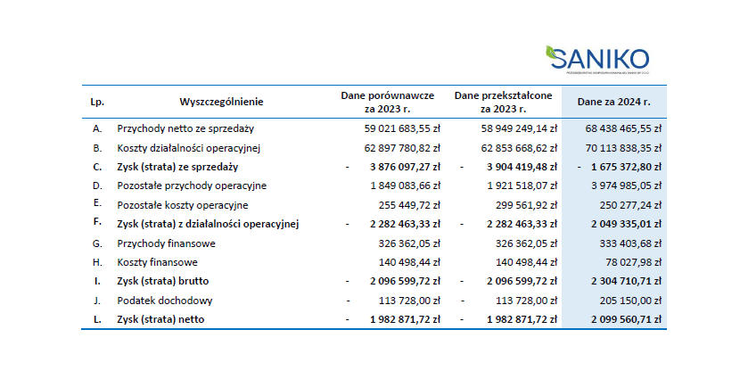 Z opublikowanego sprawozdania wynika, że rok 2024 zakończył się dla Saniko wyjątkowo pomyślnie. Zysk brutto Grupy wyniósł 5,23 mln zł, a zysk netto 3,39 mln zł, co stanowi diametralną zmianę w stosunku do roku 2023, kiedy spółka Saniko notowała stratę ponad 2 mln zł. To imponujący skok – pytanie tylko, czym dokładnie spowodowany.