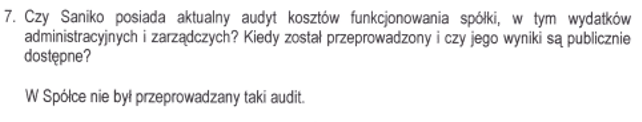 W odniesieniu do kwestii audytu kosztów funkcjonowania Saniko poinformowano, że dotychczas nie był przeprowadzany, co oznacza, że spółka nie dysponuje niezależną analizą swoich wydatków administracyjnych i zarządczych. To informacja, która może rodzić pytania o sposób kontroli kosztów i gospodarowanie środkami publicznymi.