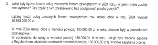 Saniko informuje, że wszystkie inwestycje z 2024 roku zostały sfinansowane ze środków własnych i mieściły się w zaplanowanych kosztach. Łączny koszt usług zlecanych firmom zewnętrznym wyniósł 20,88 mln zł, a większe zlecenia realizowano w trybie przetargowym. Nie sposób jednak dowiedzieć się z odpowiedzi, jakie to były inwestycje ani kto konkretnie z tych przetargów skorzystał. Informacje – choć zgodne z przepisami – nie przybliżają mieszkańców do zrozumienia, na co dokładnie idą ich pieniądze.
