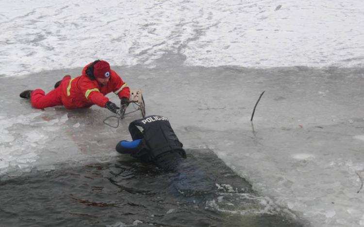 Policjanci Ogniwa Prewencji na Wodach wraz ze swymi kolegami, ratownikami WOPR Włocławek i Państwowej Straży Pożarnej inscenizowali różne okoliczności, z którymi mogą zetknąć się łyżwiarze, wędkarze i inni.