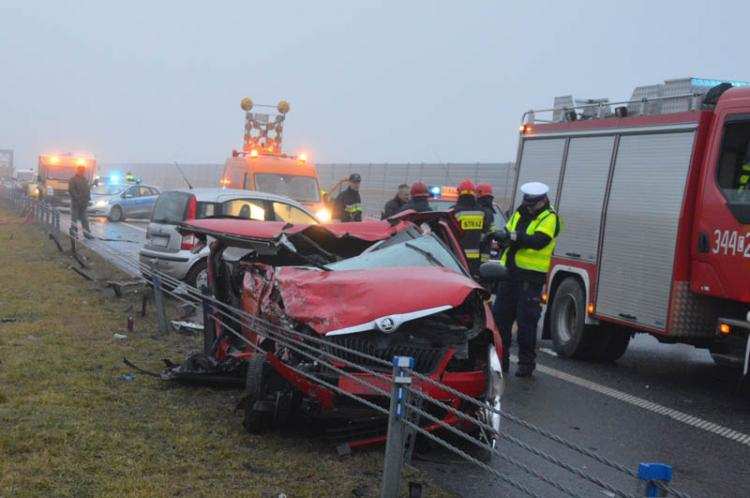 W poniedziałek (19.12.) około godziny 6: 00 na autostradzie A1 (118,8 km) doszło do tragicznego w skutkach wypadku. Kierowca skody fabia jadący w kierunku Gdańska z nieznanych przyczyn nagle uderzył w tylny narożnik naczepy ciężarówki marki renault premium jadącej w tym samym kierunku a przewożącej fragment dźwigu. Siła uderzenia spowodowała zjechanie z pasa drogi i pojazd osobowy dodatkowo uderzył w barierki ochronne. 38- letni pasażer skody poniósł śmierć na miejscu a 28 – letni kierowca trafił do szpitala.