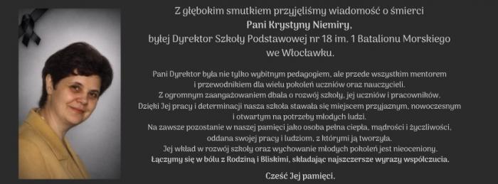 Z głębokim smutkiem przyjęto wiadomość, która poruszyła szkolną społeczność. Odeszła Krystyna Niemira – była dyrektor Szkoły Podstawowej nr 18 im. 1 Batalionu Morskiego we Włocławku.