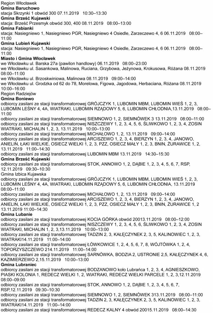 Energa Operator zaplanowała kolejne wyłączenia prądu we Włocławku i Powiecie Włocławskim. Wyłączenia w miejscowościach na terenie Powiatu Włocławskiego i Włocławka zaplanowano w dniach od 6.11.2019 do 15.11.2019. Poniżej prezentujemy wykaz miejscowości w Powiecie Włocławskim i ulic we Włocławku, w których w najbliższym czasie zabraknie prądu.
