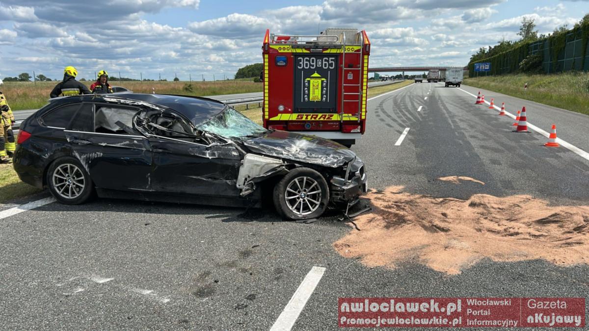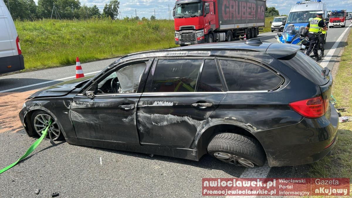 Galeria zdjęć z wypadku na autostradzie A1 w Dziankowie: rozbity BMW, uszkodzony samochód ciężarowy, intensywne działania straży pożarnej i zespół ratownictwa medycznego, przemieszczanie ruchu na pas awaryjny, brygadier Bladoszewski podczas akcji. Uwaga i ostrożność na drodze!