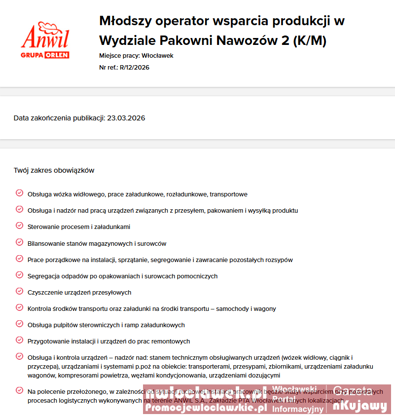 Oferty pracy we Włocławku. ANWIL szuka ludzi do produkcji i utrzymania ruchu