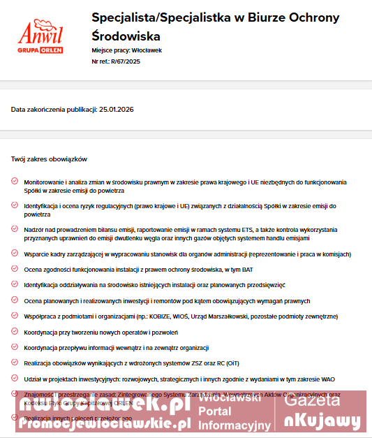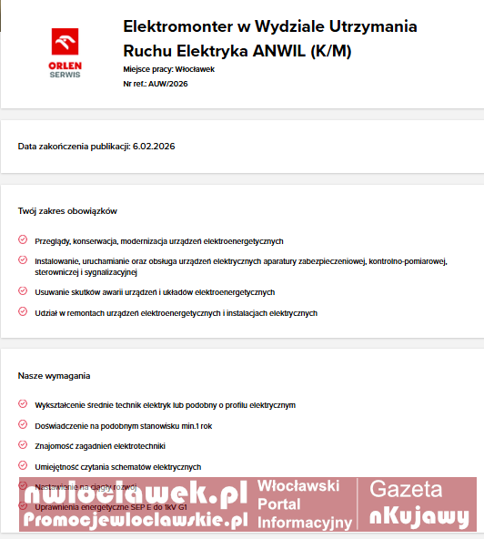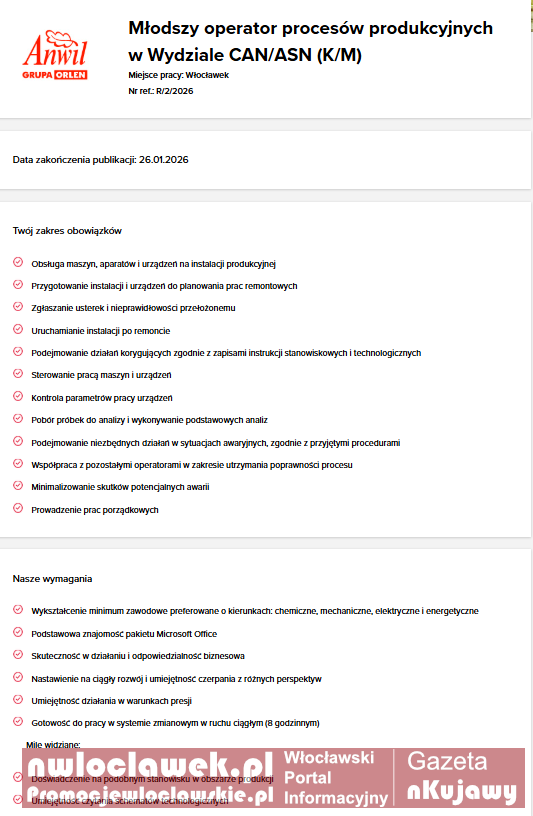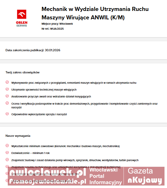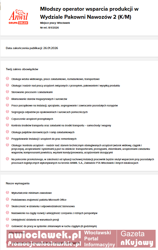 Praca Włocławek: trwa rekrutacja w ANWIL i ORLEN Serwis. Sprawdź aktualne oferty