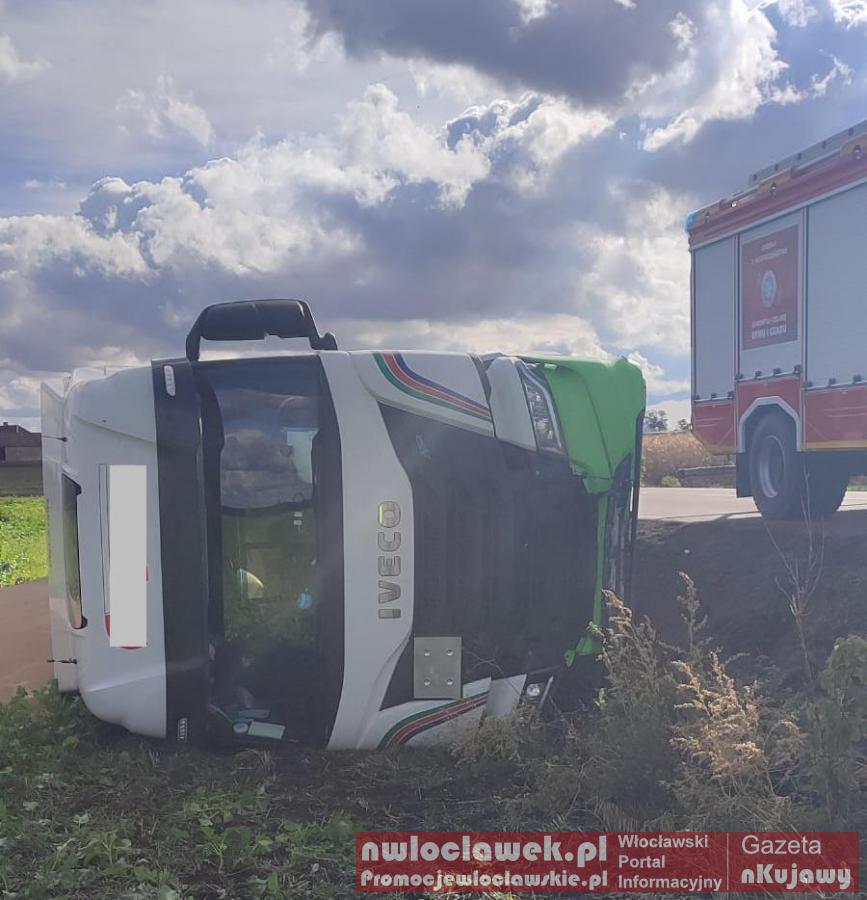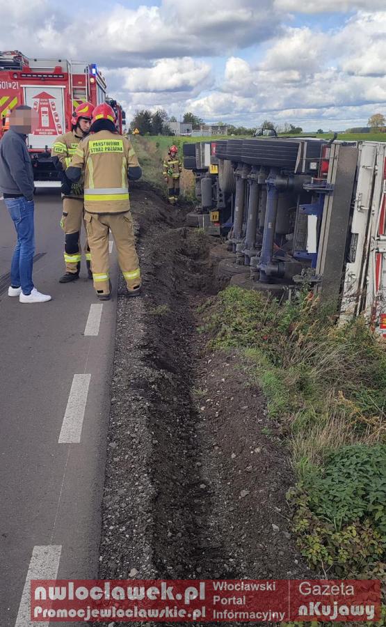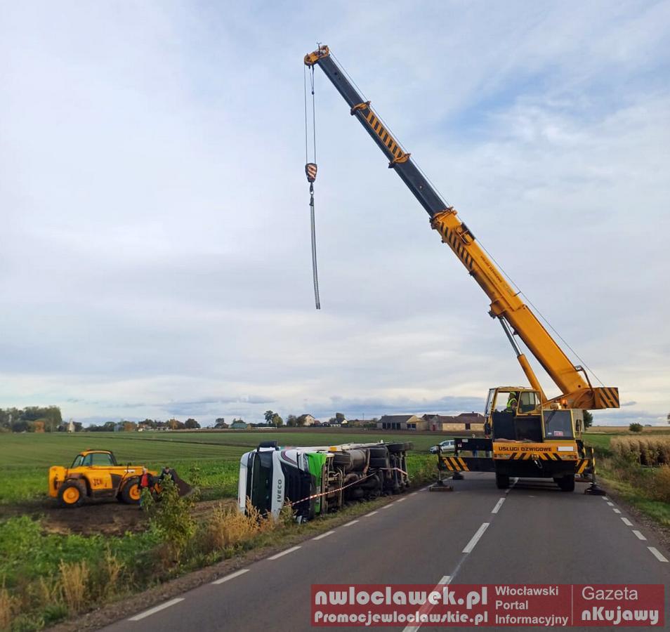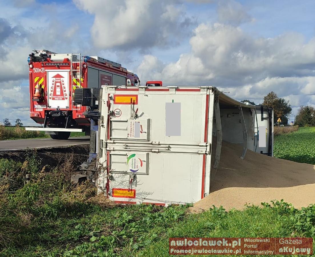 Galeria zdjęć z zdarzenia, które miało miejsce wczoraj w Bronisławiu, na drodze Dobre-Kruszwica. Ciężarowy Iveco 55-latka przewrócił się na bok po zjechaniu na pobocze. Mimo tego kierujący wyszedł bez obrażeń, była trzeźwy. Zboże rozsypało się na pole, a do jego usunięcia użyto dźwigu i ładowarki. Policja pouczyła mężczyznę po incydencie.