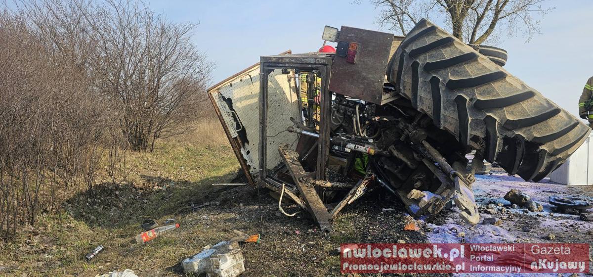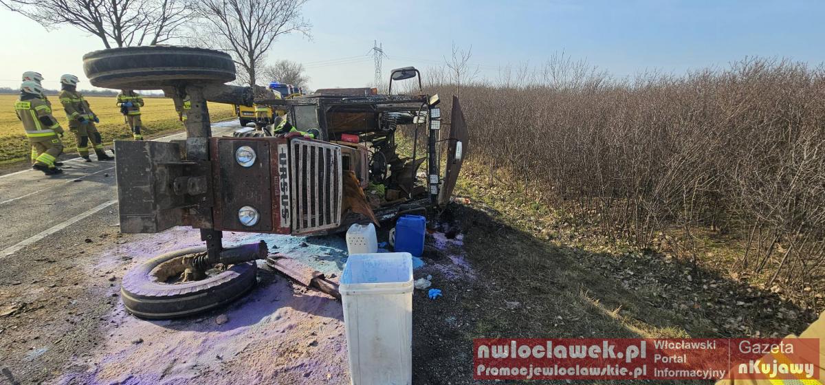 Zderzenie busa z ciągnikiem na DK62. Traktor przewrócony, droga całkowicie zablokowana