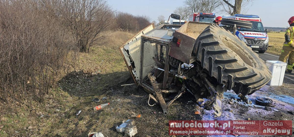 Zdjęcia Zderzenie busa z ciągnikiem na DK62. Traktor przewrócony, droga całkowicie zablokowana - fotorelacja