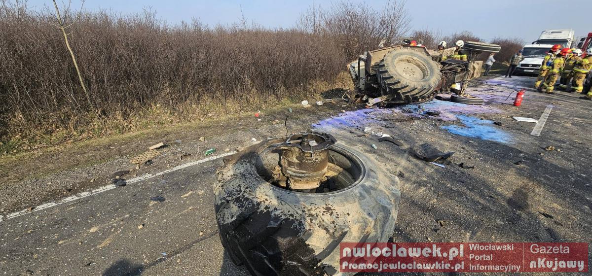 Zderzenie busa z ciągnikiem na DK62. Traktor przewrócony, droga całkowicie zablokowana